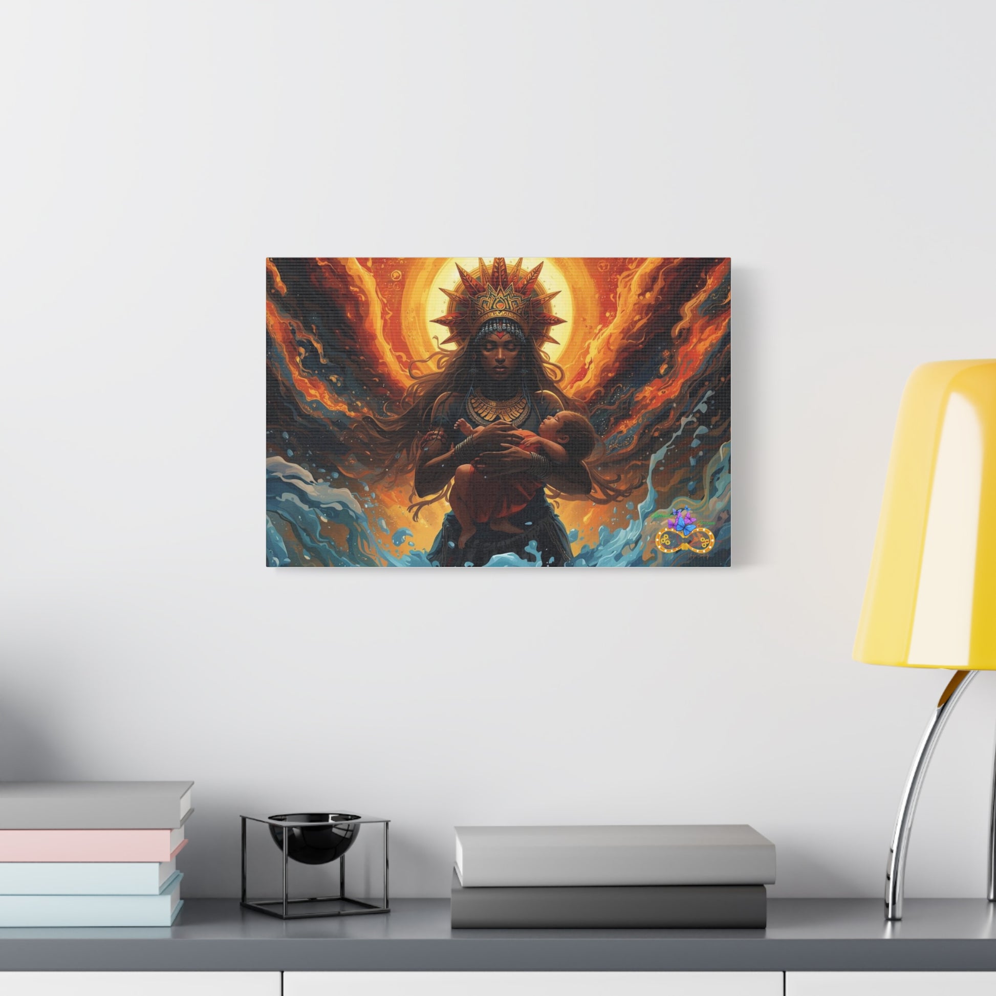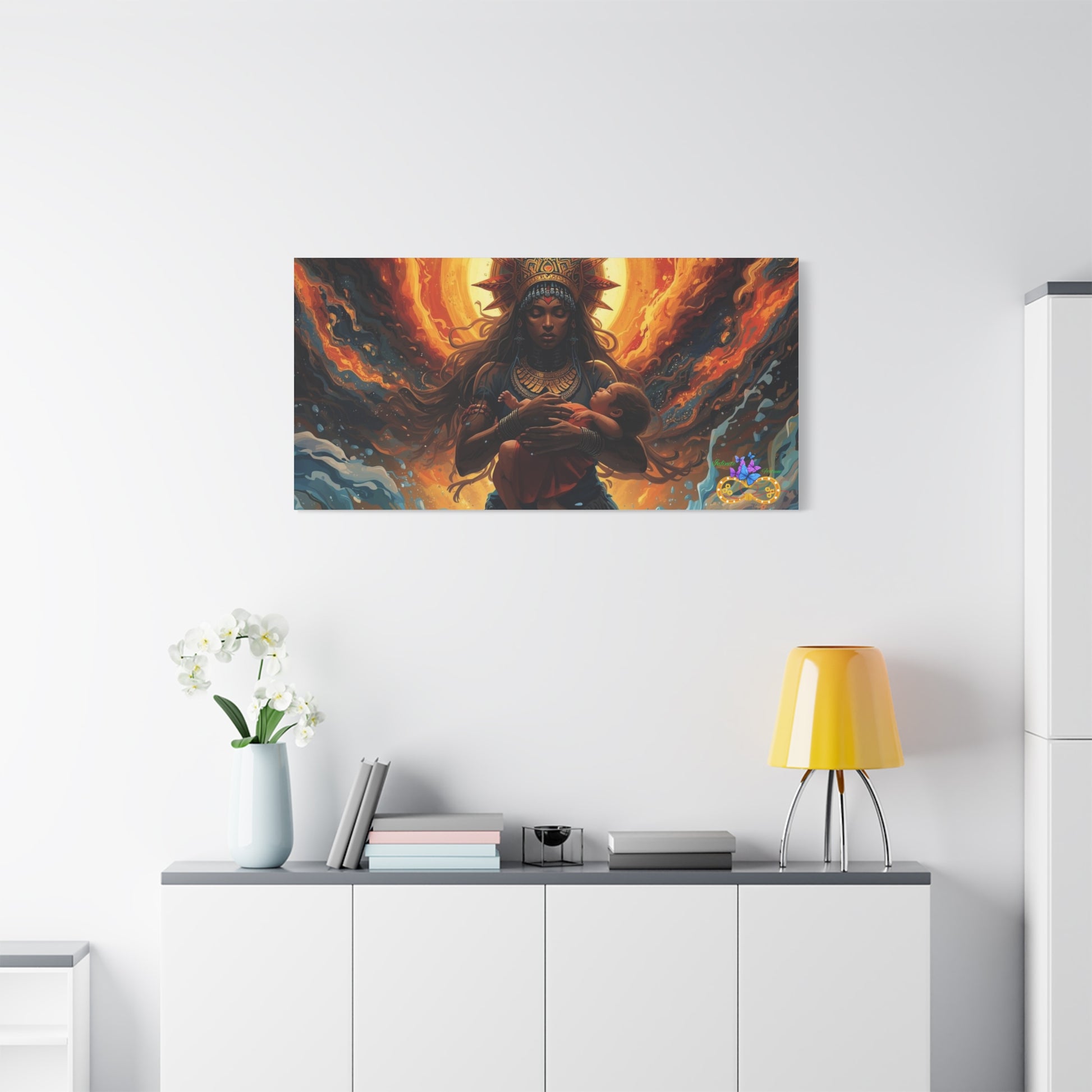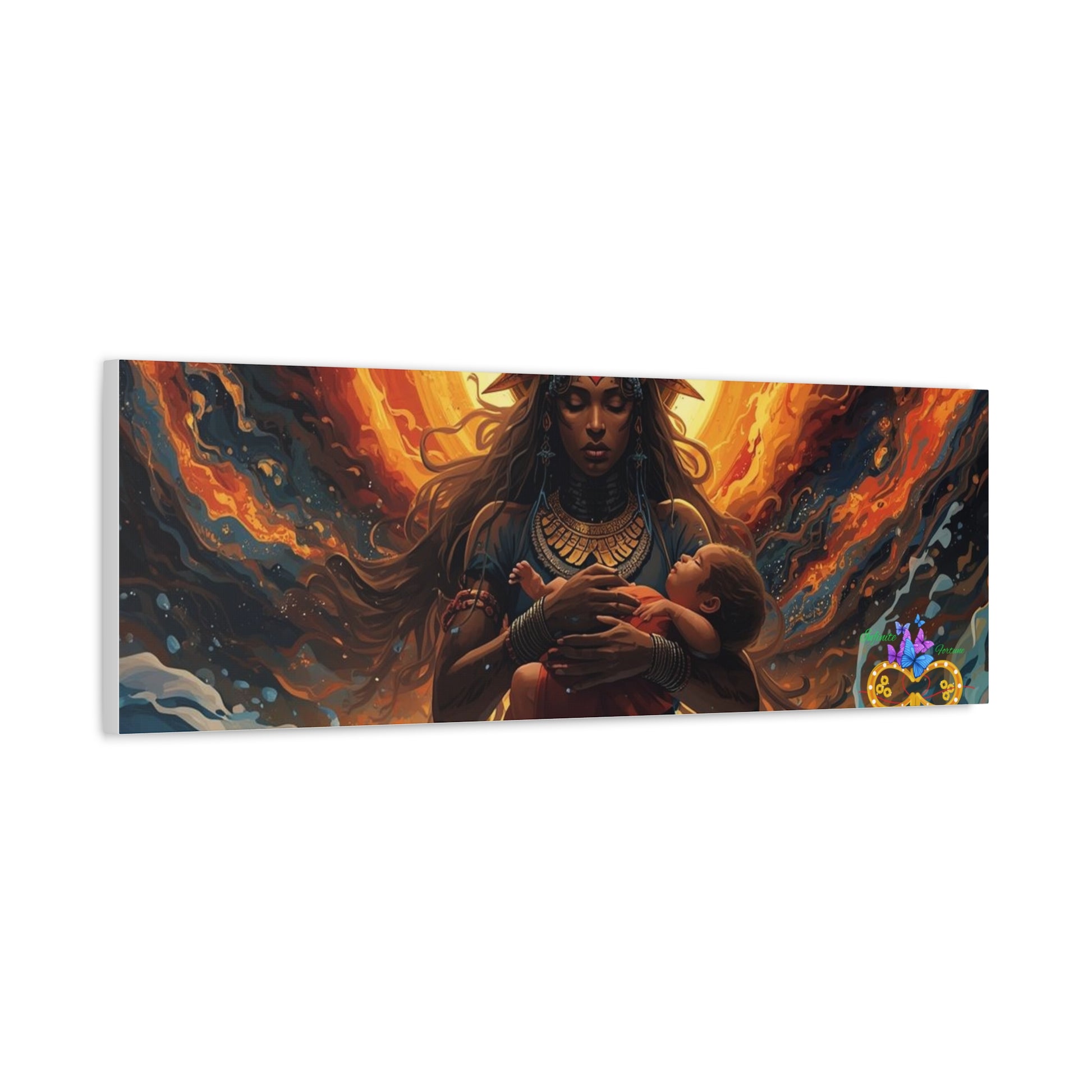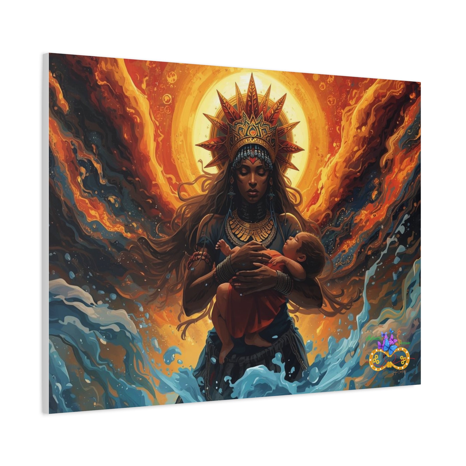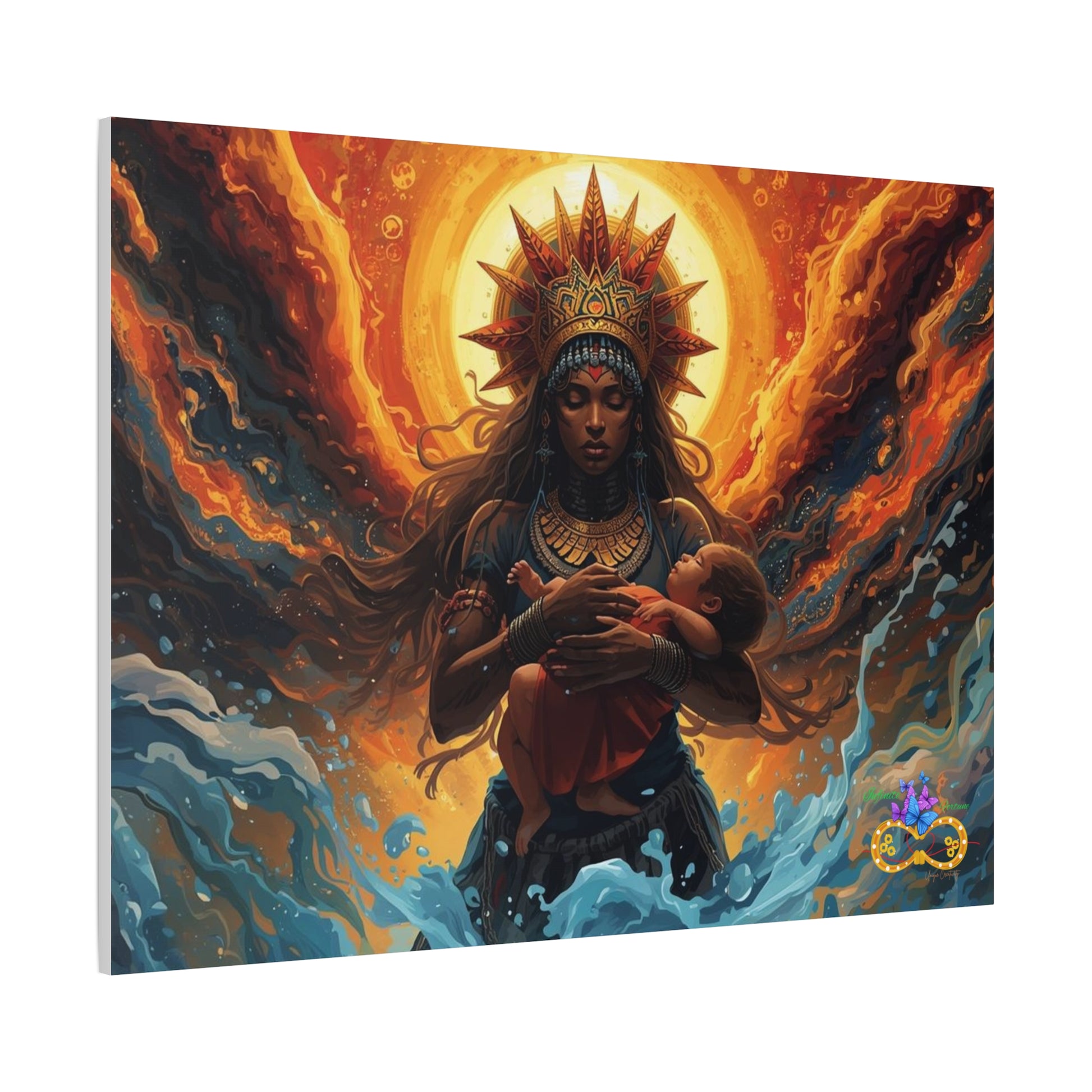 Bring spiritual power and divine femininity into your space with this stunning piece inspired by Erzulie Dantor, the fierce mother spirit of strength, love, and protection. Bathed in radiant tones of gold, deep ocean blue, and sacred fire, this artwork captures a moment of sacred motherhood and resilience.