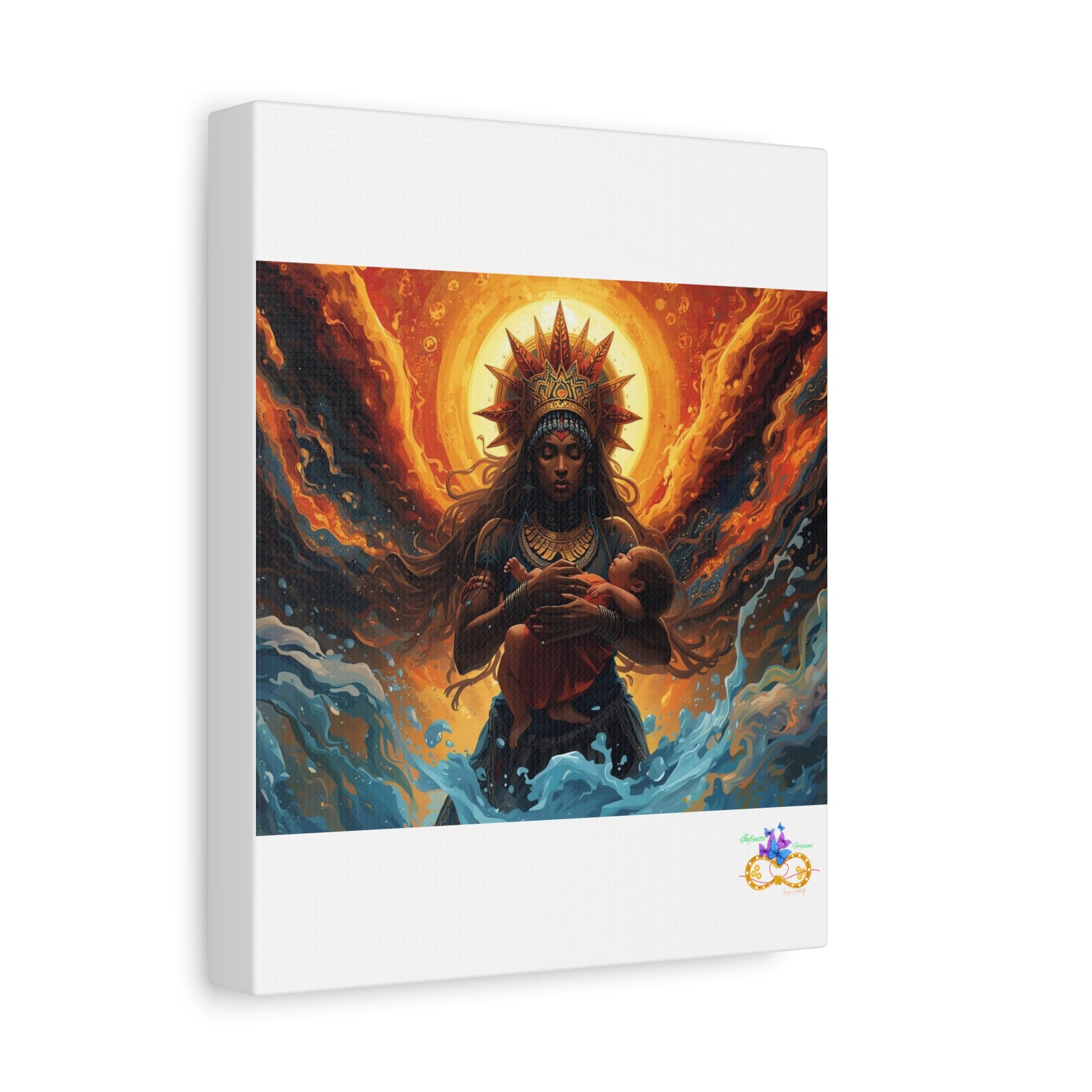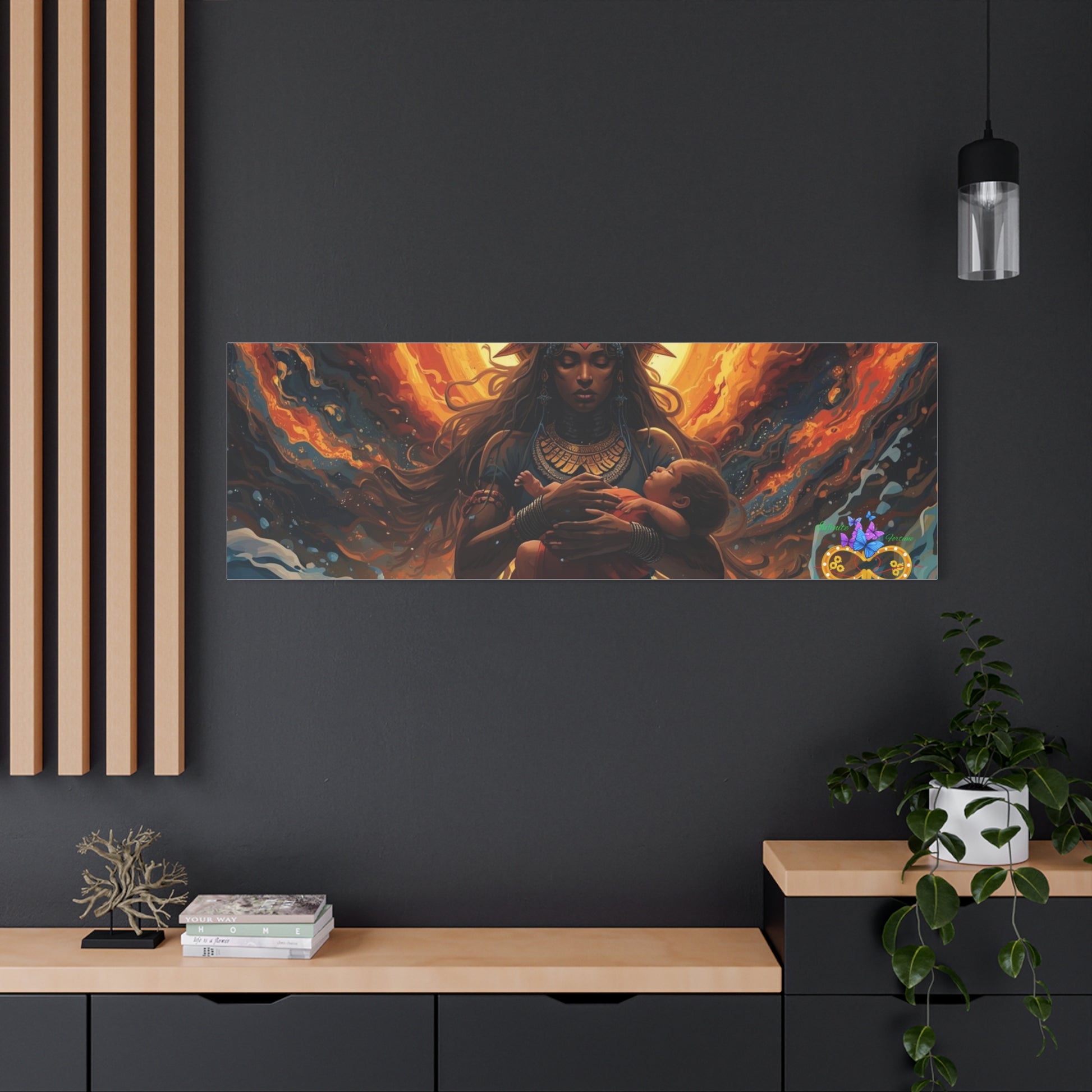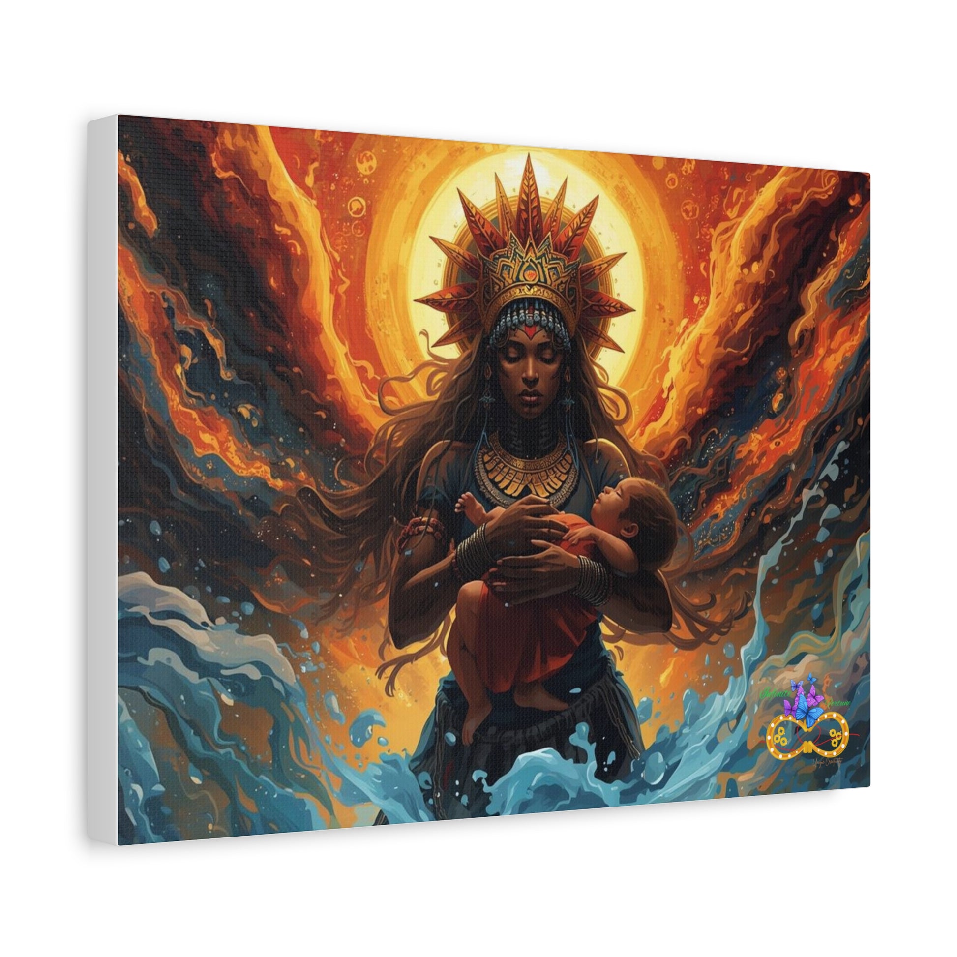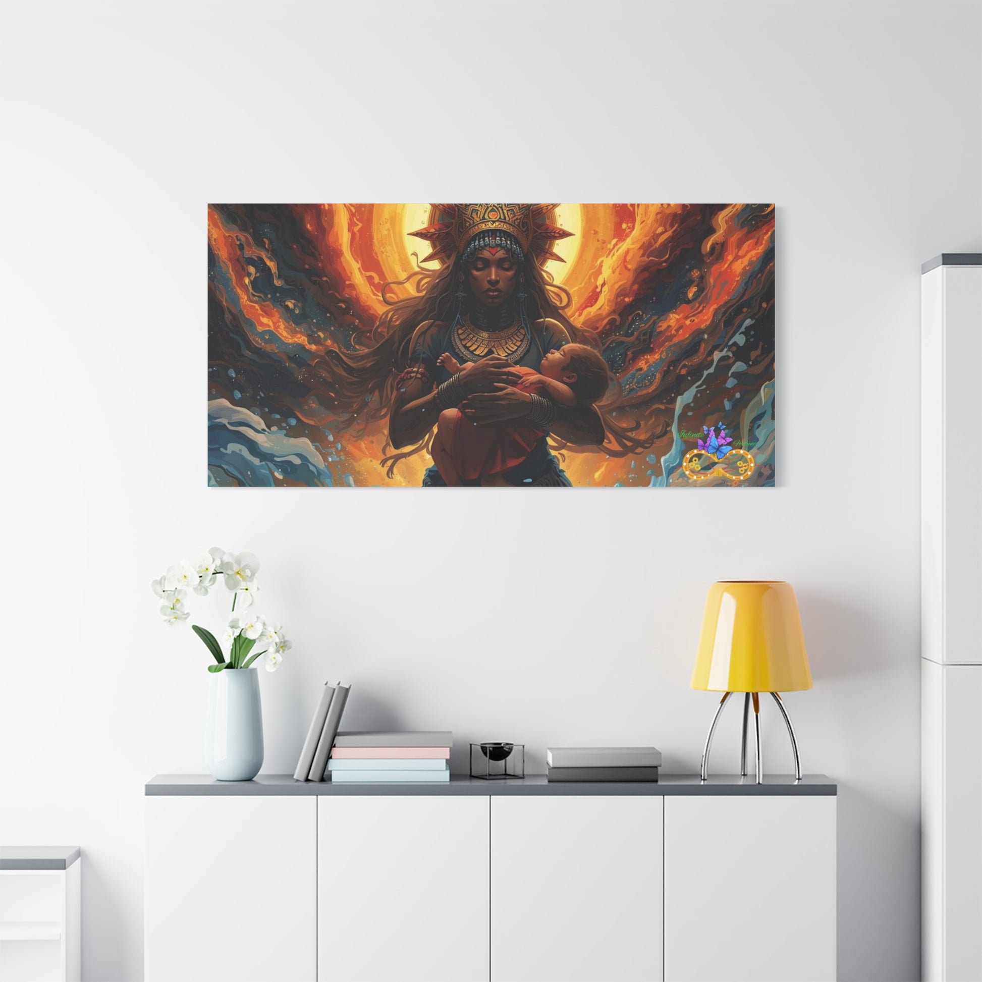Bring spiritual power and divine femininity into your space with this stunning piece inspired by Erzulie Dantor, the fierce mother spirit of strength, love, and protection. Bathed in radiant tones of gold, deep ocean blue, and sacred fire, this artwork captures a moment of sacred motherhood and resilience.