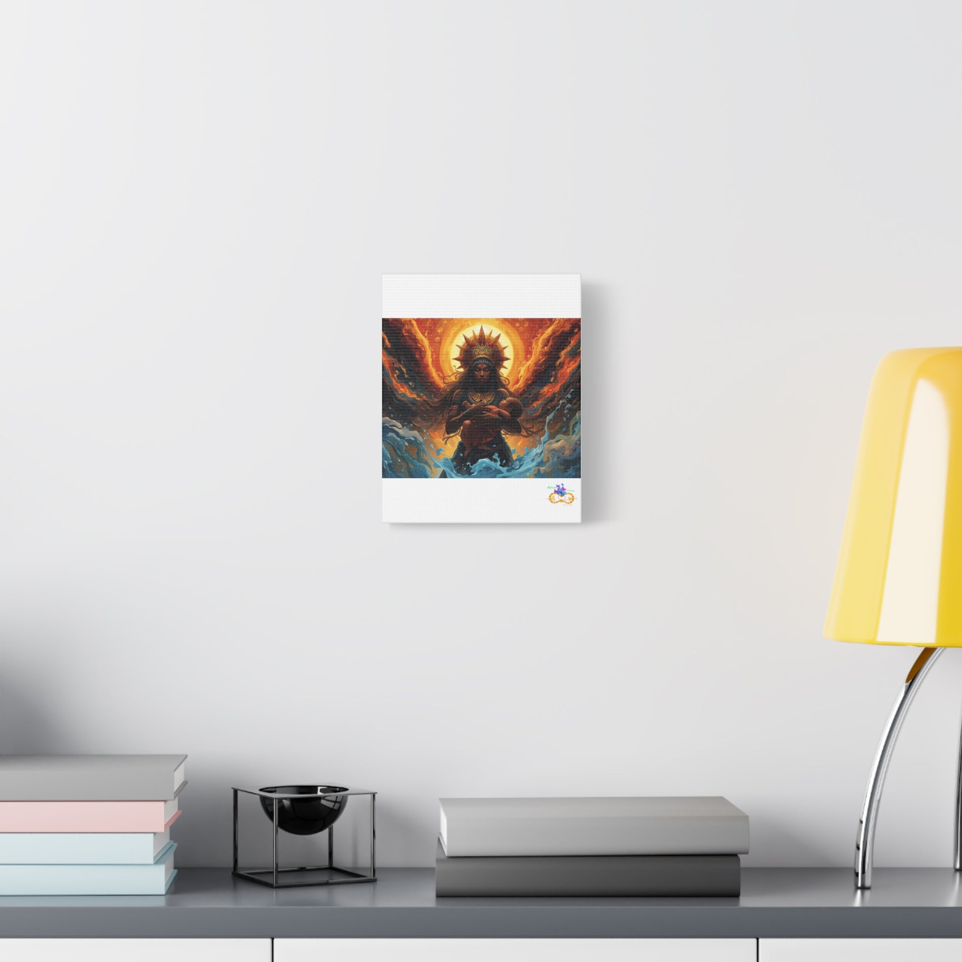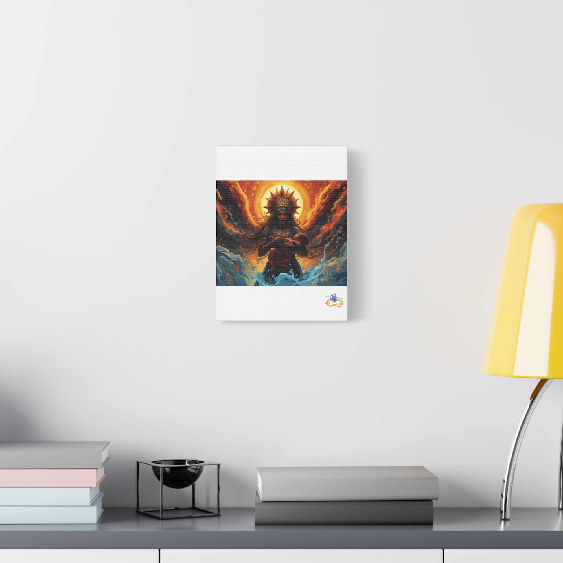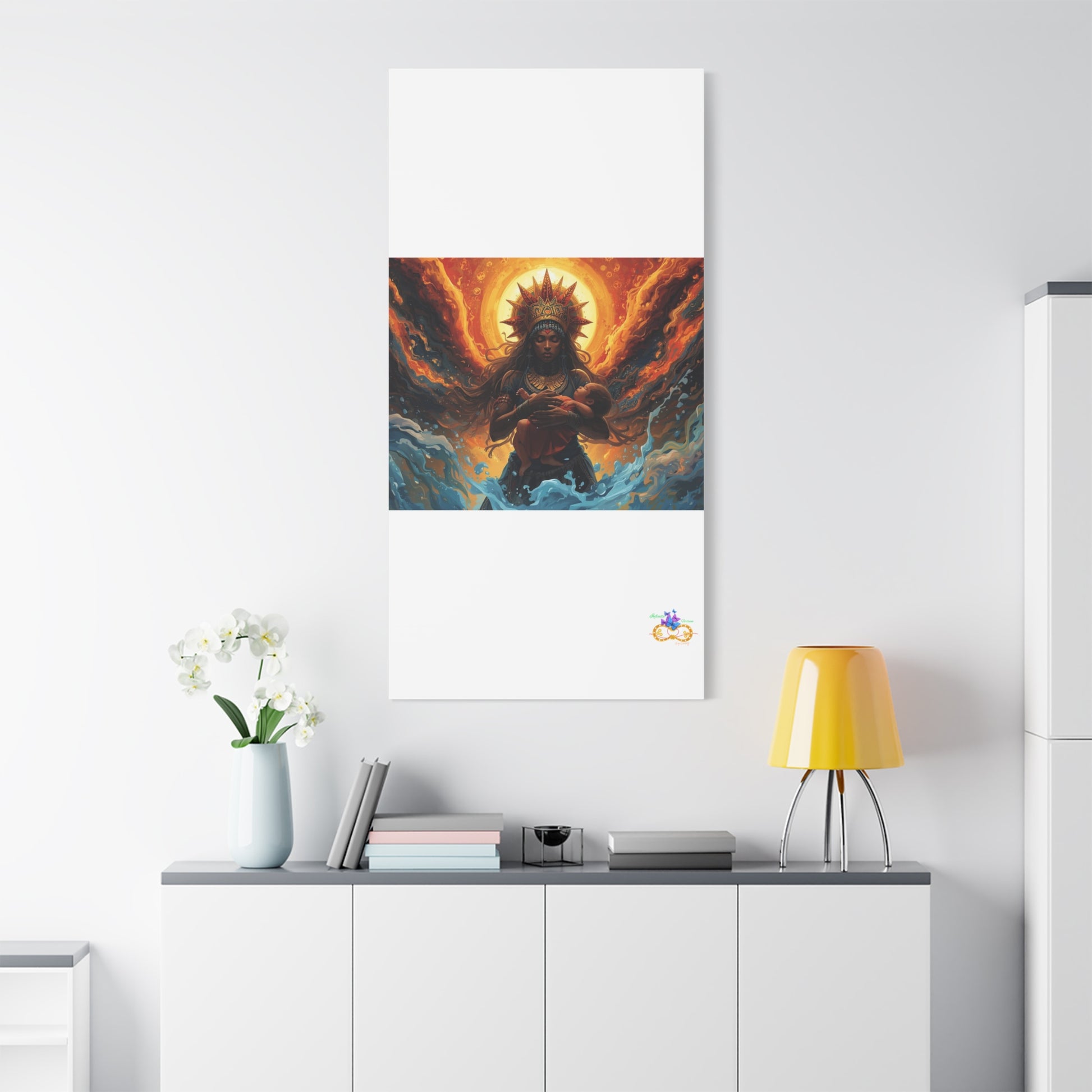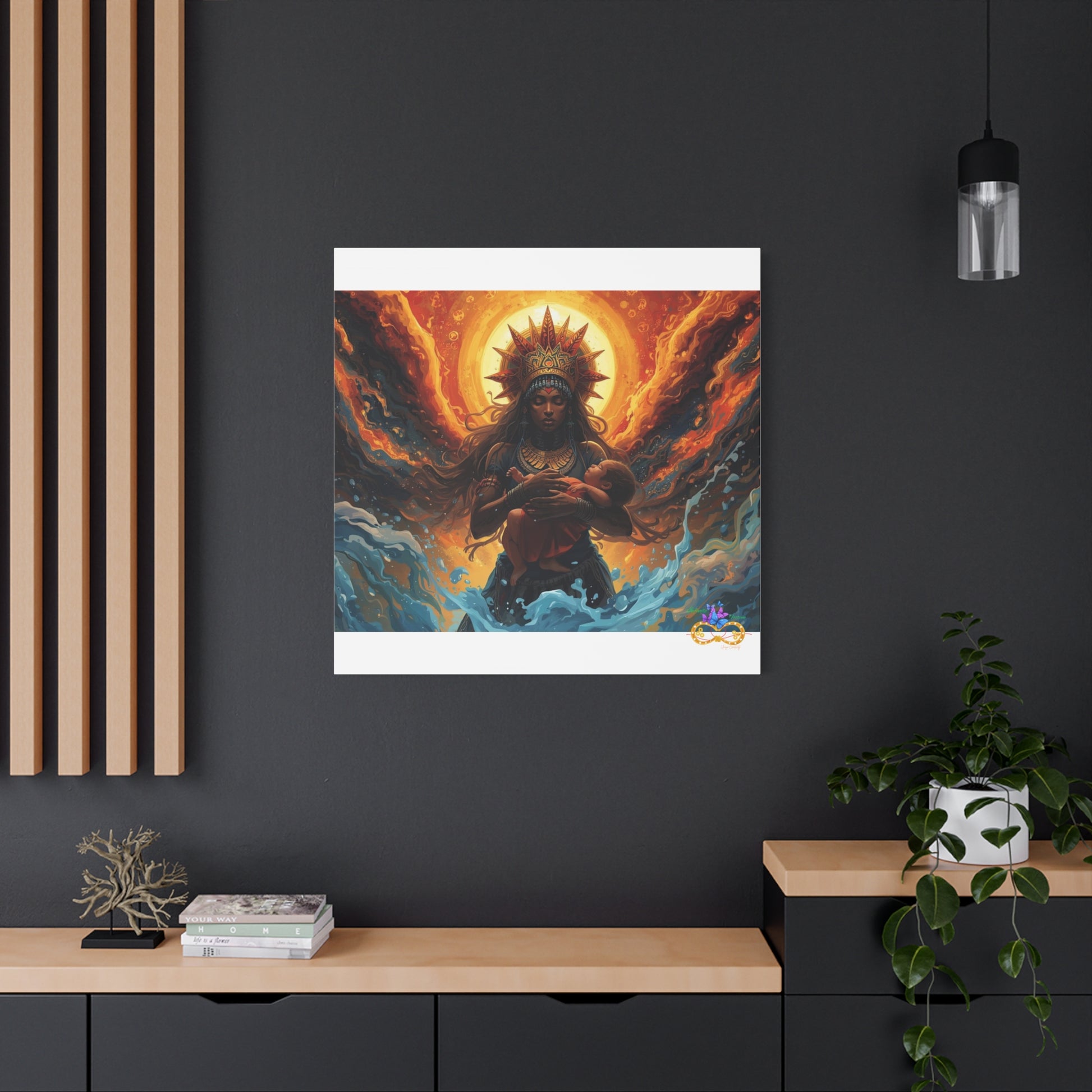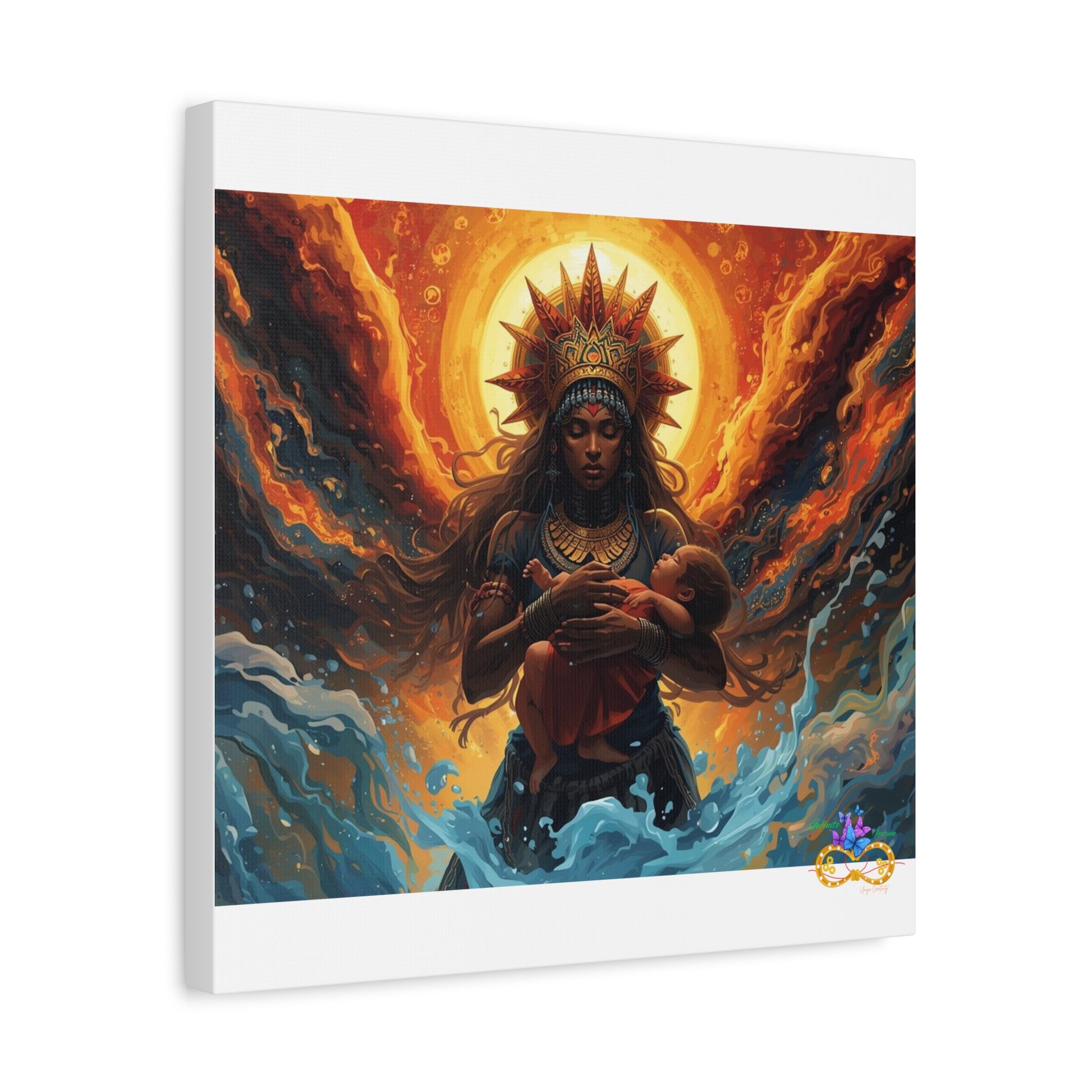 Bring spiritual power and divine femininity into your space with this stunning piece inspired by Erzulie Dantor, the fierce mother spirit of strength, love, and protection. Bathed in radiant tones of gold, deep ocean blue, and sacred fire, this artwork captures a moment of sacred motherhood and resilience.